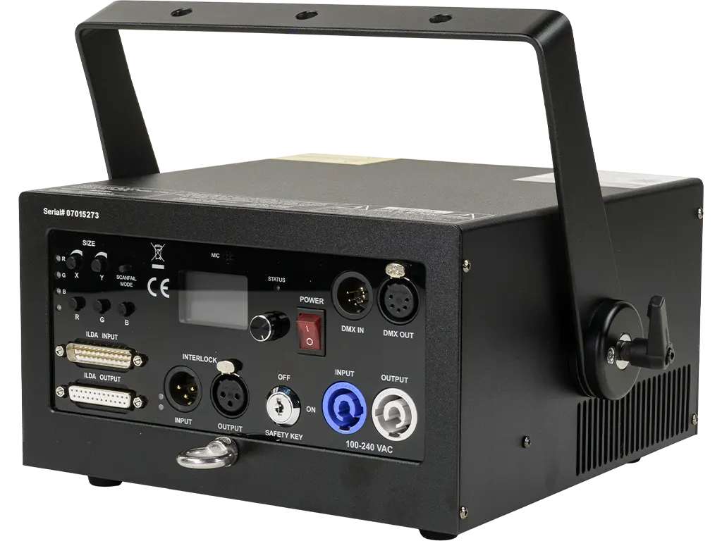 | System Features: | Adjustments for color channels (R,G,B), size/position/invert (X,Y), DMX in/out, ILDA in/out, Estop in/out, power in/out, sound active mode, digital display for DMX address and settings |