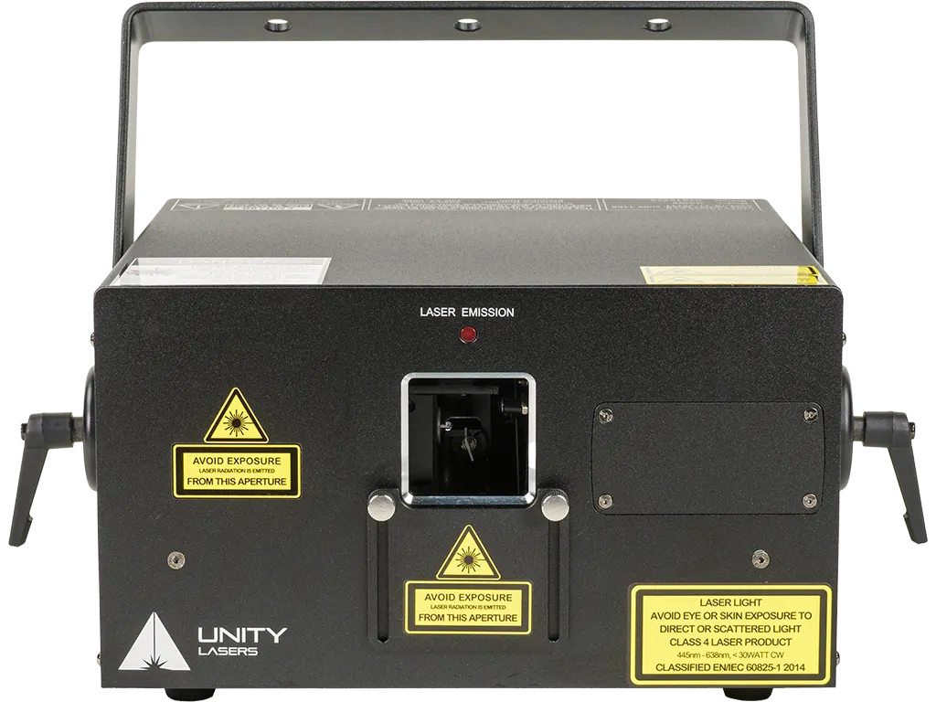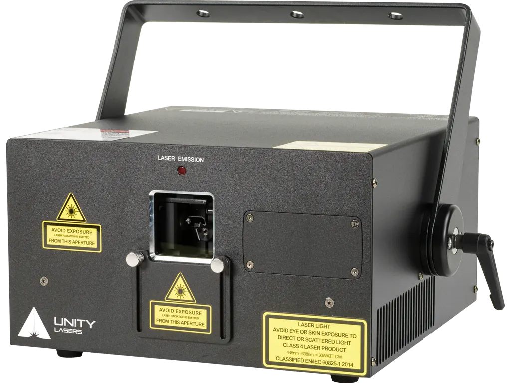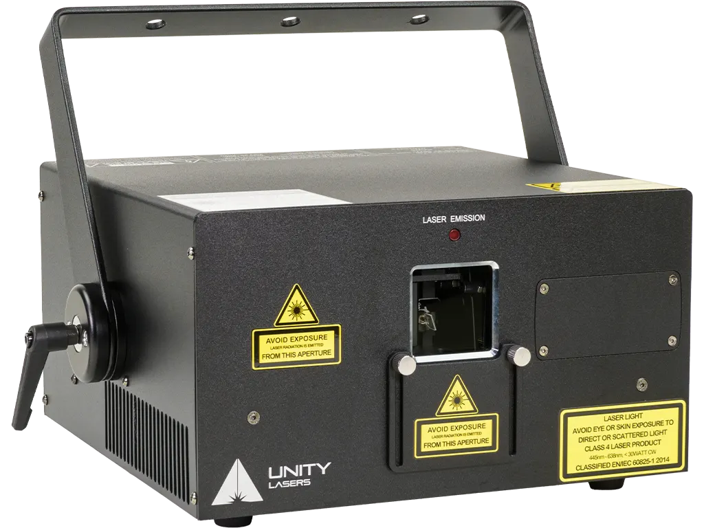 The Unity RAW 3 is a full-color, ILDA-compatible, RGB diode-based laser projector, with a native DMX control system included also. It is a cost-effective laser show system equipped with the capability to produce mesmerizing aerial beam effects and highly detailed laser graphics, logos, and text. Ideal for consumer and home applications.