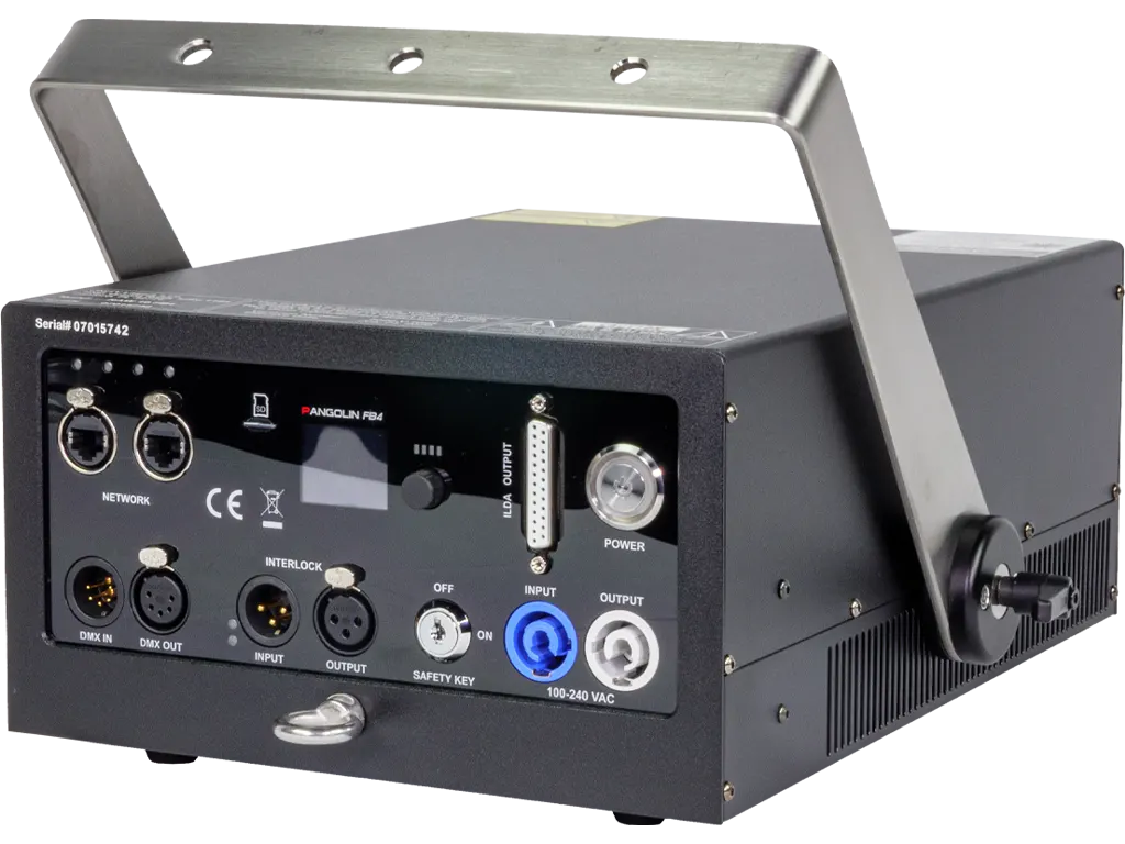 | System Features: | All the adjustments, such as power output of each color, X & Y axes invert, X & Y size and position, safety, etc., are managed digitally by the FB4 control system. Ethernet in/out, power in/out, DMX in/out, Estop in/out |