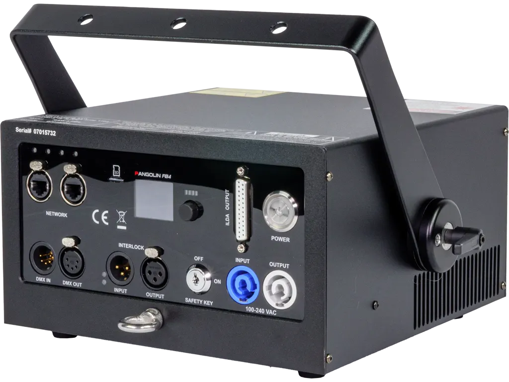 | System Features: | All the adjustments, such as power output of each color, X & Y axes invert, X & Y size and position, safety, etc., are managed digitally by the FB4 control system. Ethernet in/out, power in/out, DMX in/out, Estop in/out |